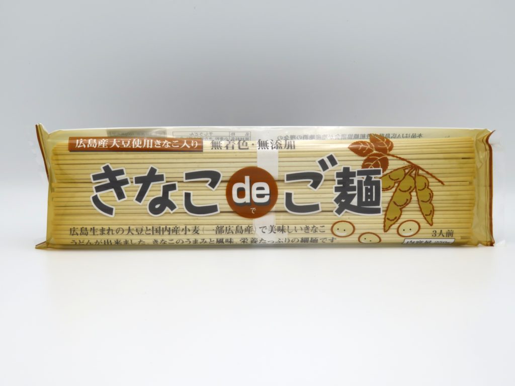 広島産大豆が入ったきな粉をうどんにいれた商品。きな粉の旨みと風味、栄養たっぷりの細麺。